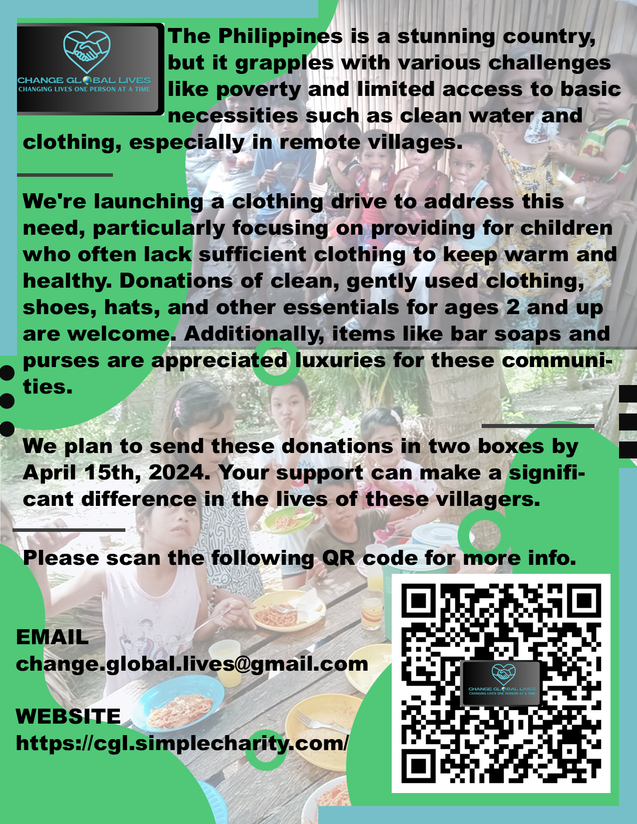 That said, we are starting a clothing drive to collect and send new or gently used clothing, shoes, hats, and other similar items for ages 2 and up to the Philippines. These donations will make a huge difference in the lives of these villagers, who will be so happy and thankful.